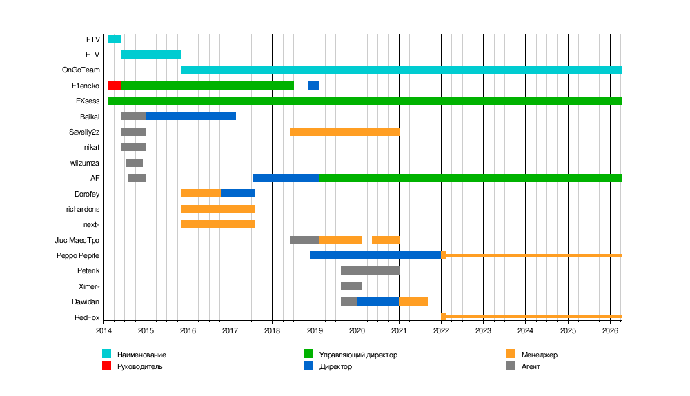 Фаундерами организации являются EXsess и F1encko (уволен в 2019-м году), на 2024-й год высшей должностью организации является управляющий директор, которую занимают EXsess и [[Parrrate|AF]]. | |||