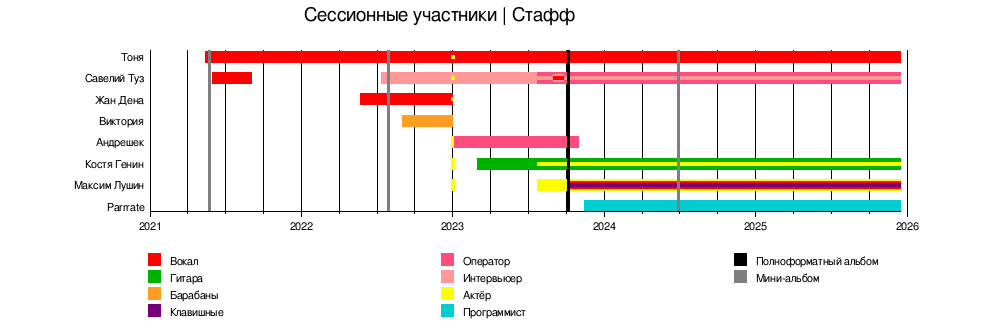 Неотъемлемыми участниками группы является трио Гера Глок, Дрёми, и Дрюня Воронеж, стоящее у истоков коллектива. В группе также состоят сессионные участники ‒ люди, вносящие заметный, но не постоянный вклад в творчество группы, а также концертные участники. "ИСШ-СТАФФ" ‒ это круг близких группе людей.