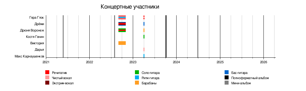 *[[Колосс|Николай '''"Колосс"''' Бухарин]] (2021){{Тире}}вокал, музыка, гитара, клавишные | *[[Колосс|Николай '''"Колосс"''' Бухарин]] (2021){{Тире}}вокал, музыка, гитара, клавишные | ||