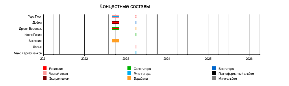 Неотъемлемыми участниками группы являются Гера Глок, Дрёми, и Дрюня Воронеж. Трио стоит у истоков коллектива, пишет и продюсирует всю музыку группы.