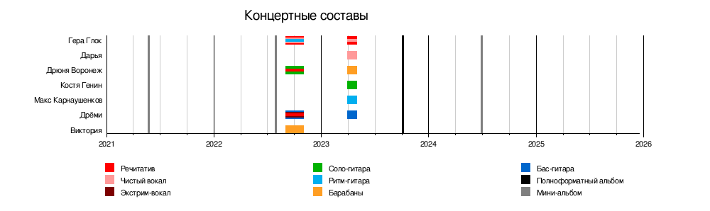 bar:Vika from:01/09/2022 till:01/11/2022 color:Drums | bar:Vika from:01/09/2022 till:01/11/2022 color:Drums | ||
