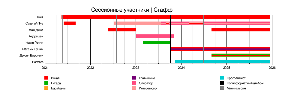 Также к составу группы относятся сессионные участники ‒ это люди, вносящие заметный, но не постоянный вклад в творчество группы, а "ИСШ-Стафф" ‒ это люди, работающие над не-музыкальным контентом группы.