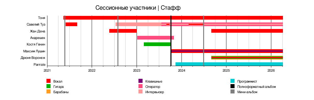 Также к составу группы относятся сессионные участники ‒ это люди, вносящие заметный, но не постоянный вклад в творчество группы, а "ИСШ-Стафф" ‒ это люди, работающие над не-музыкальным контентом группы.