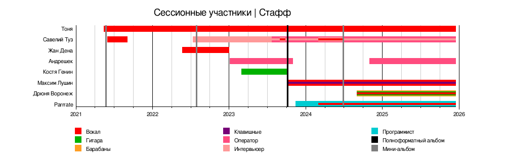 Также к составу группы относятся сессионные участники ‒ это люди, вносящие заметный, но не постоянный вклад в творчество группы, а "ИСШ-Стафф" ‒ это люди, работающие над не-музыкальным контентом группы.