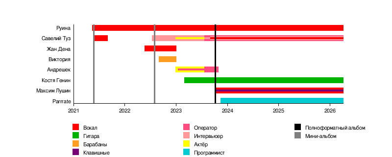 bar:Ruina from:14/05/2021 till:end color: | bar:Ruina from:02/03/2021 till:14/05/2021 color:Vocals | ||
