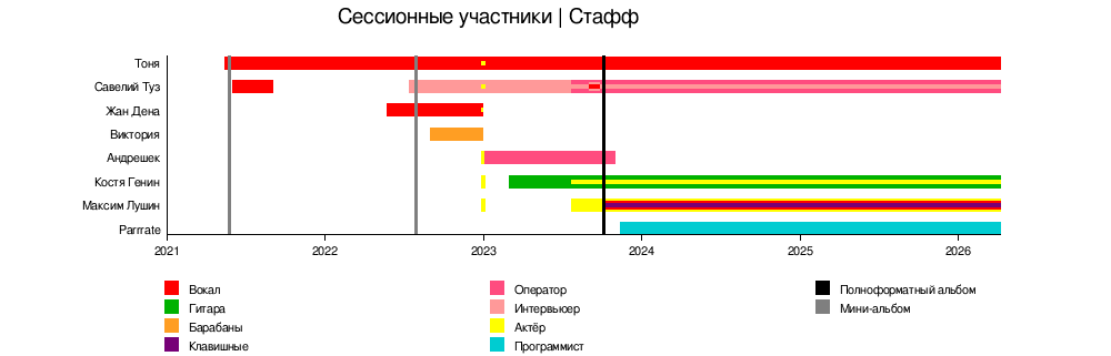 bar:Ruina from:14/05/2021 till:end color:Vocals | bar:Ruina from:14/05/2021 till:end color:Vocals | ||