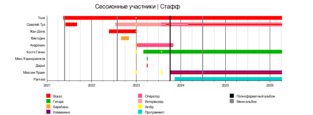 Также к составу группы относятся сессионные участники ‒ это люди, вносящие заметный, но не постоянный вклад в творчество группы, а также концертные участники, и "ИСШ-Стафф" ‒ это люди, работающие над не-музыкальным контентом группы.