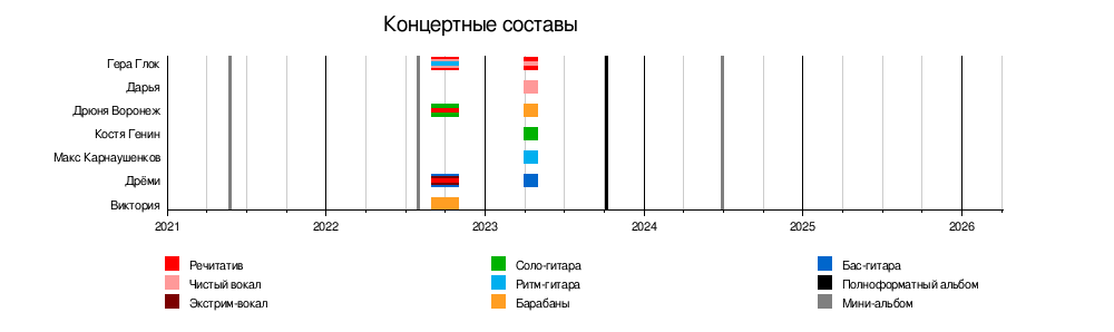 bar:Vika from:01/09/2022 till:01/11/2022 color:Drums | bar:Vika from:01/09/2022 till:01/11/2022 color:Drums | ||