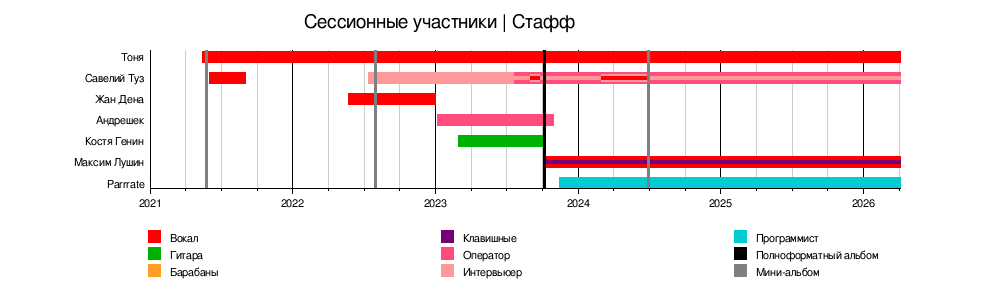 bar:Kostya from:02/03/2023 till:06/10/2023 color:Guitar | bar:Kostya from:02/03/2023 till:06/10/2023 color:Guitar | ||