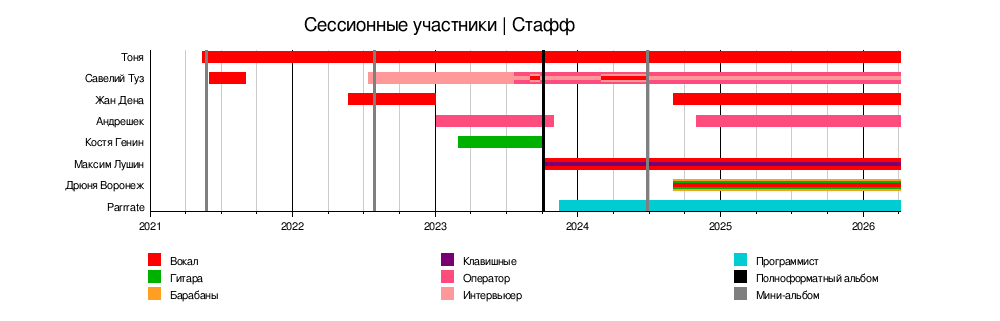 bar:Kostya from:02/03/2023 till:06/10/2023 color:Guitar | bar:Kostya from:02/03/2023 till:06/10/2023 color:Guitar | ||