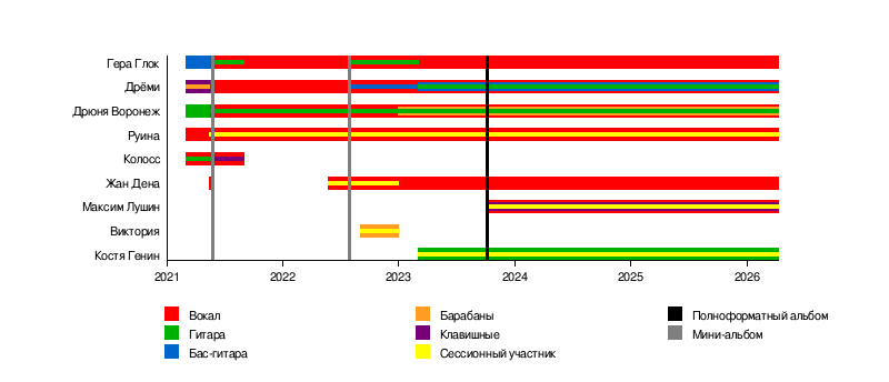 Неотъемлемыми участниками группы является трио Гера Глок, Дрёми, и Дрюня Воронеж, стоящее у истоков коллектива. В группе также состоят сессионные участники - люди, вносящие заметный, но не постоянный вклад в творчество группы, а также концертные участники. "ИСШ-СТАФФ" - это круг близких группе людей.