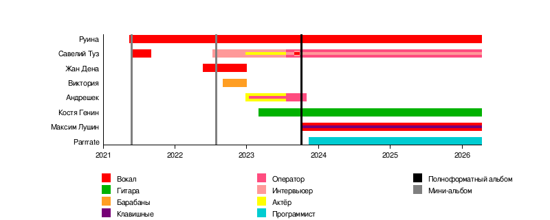 bar:Ruina from:14/05/2021 till:end color:Vocals | bar:Ruina from:14/05/2021 till:end color:Vocals | ||