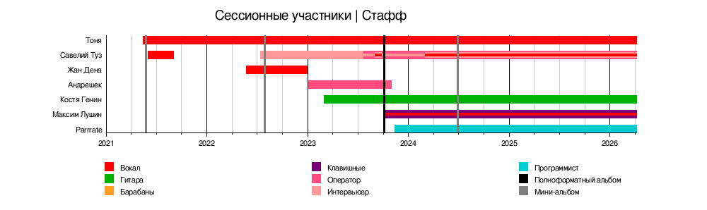 Также к составу группы относятся сессионные участники ‒ это люди, вносящие заметный, но не постоянный вклад в творчество группы, а "ИСШ-Стафф" ‒ это люди, работающие над не-музыкальным контентом группы.