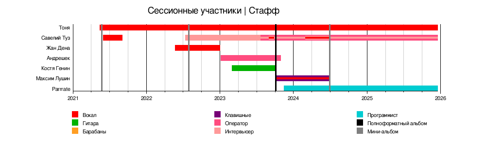 Также к составу группы относятся сессионные участники ‒ это люди, вносящие заметный, но не постоянный вклад в творчество группы, а "ИСШ-Стафф" ‒ это люди, работающие над не-музыкальным контентом группы.