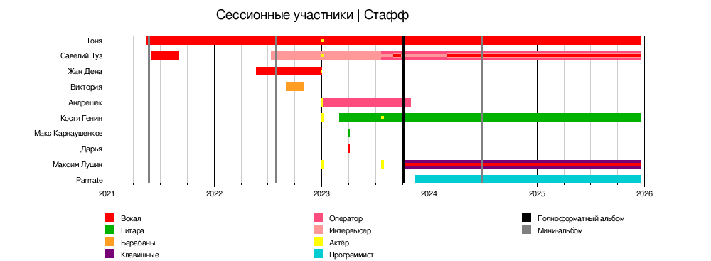 Также к составу группы относятся сессионные участники ‒ это люди, вносящие заметный, но не постоянный вклад в творчество группы, а также концертные участники, и "ИСШ-Стафф" ‒ это люди, работающие над не-музыкальным контентом группы.