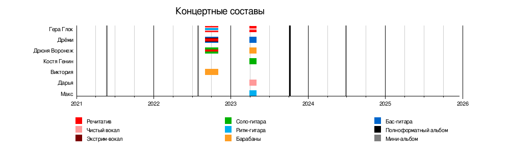 Неотъемлемыми участниками группы являются Гера Глок, Дрёми, и Дрюня Воронеж. Трио стоит у истоков коллектива, пишет и продюсирует всю музыку группы.
