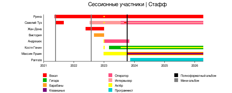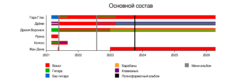 Неотъемлемыми участниками группы является трио Гера Глок, Дрёми, и Дрюня Воронеж, стоящее у истоков коллектива. В группе также состоят сессионные участники ‒ люди, вносящие заметный, но не постоянный вклад в творчество группы, а также концертные участники. "ИСШ-СТАФФ" ‒ это круг близких группе людей.