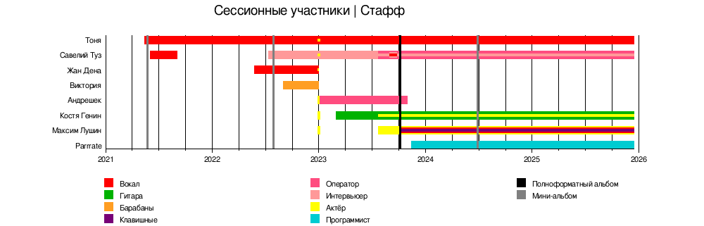 Неотъемлемыми участниками группы является трио Гера Глок, Дрёми, и Дрюня Воронеж, стоящее у истоков коллектива. В группе также состоят сессионные участники ‒ люди, вносящие заметный, но не постоянный вклад в творчество группы, а также концертные участники. "ИСШ-СТАФФ" ‒ это круг близких группе людей.