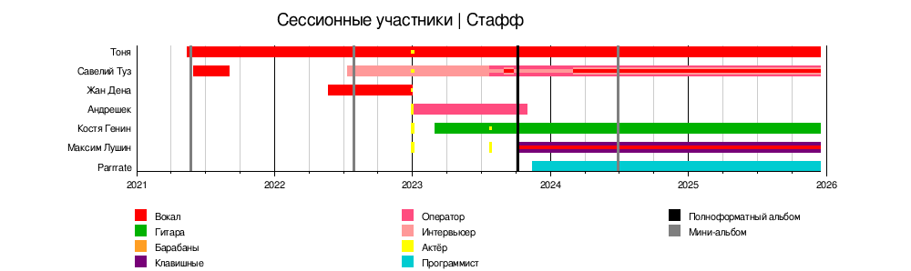 Также к составу группы относятся сессионные участники ‒ это люди, вносящие заметный, но не постоянный вклад в творчество группы, а "ИСШ-Стафф" ‒ это люди, работающие над не-музыкальным контентом группы.
